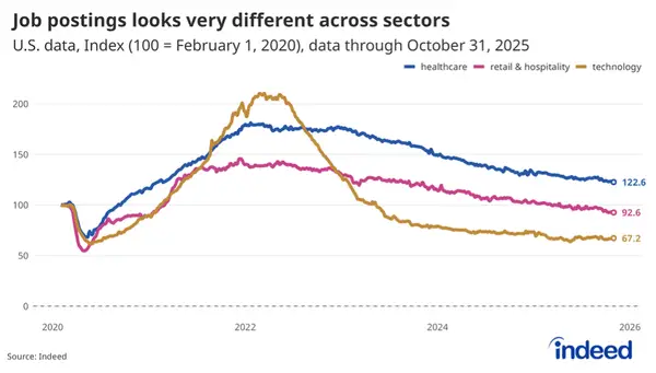 В целом по рынку Indeed фиксирует устойчивое снижение доступных рабочих мест с момента постпандемийного бума 2022 года. Однако рынок айтишных вакансий показал гораздо худшую динамику, чем некоторые другие сектора. Индекс таких вакансий Indeed достиг пика в 2022 году и с тех пор снизился в три раза — с 200 до 67 пунктов. За 100 пунктов приняты показатели на 1 февраля 2020 года, то есть прямо перед пандемией.