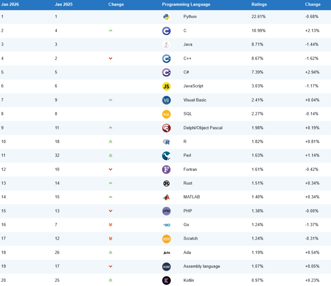 За прошедший год поменялись местами C и C++. В TIOBE отмечают, что C++ развивается небывалыми темпами. Rust в январском рейтинге достиг рекордной 13 позиции. Также огромный рывок совершил Perl — он вернулся в топовую двадцатку с 32 места на 11-е. В первую десятку с 18 места годом ранее на 10-е перепрыгнул R.