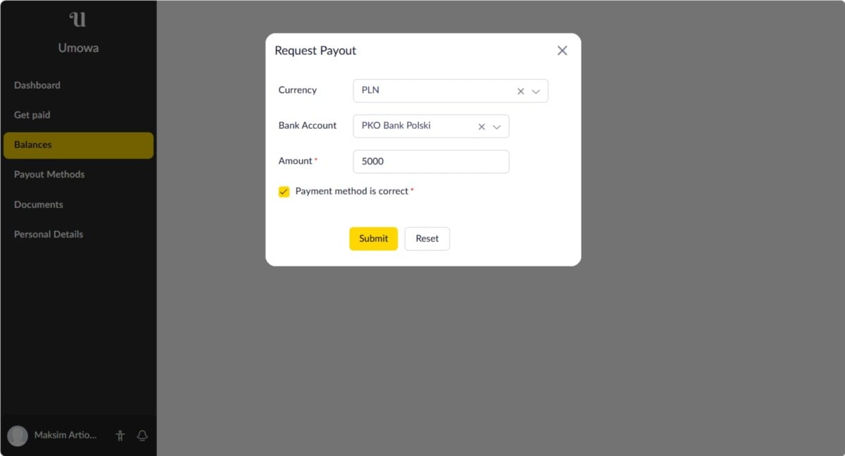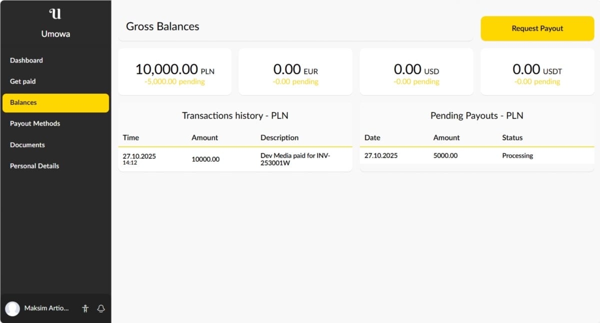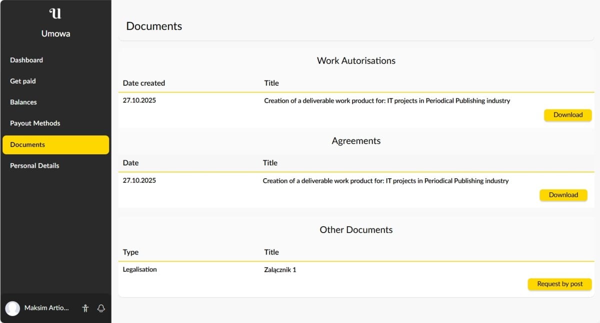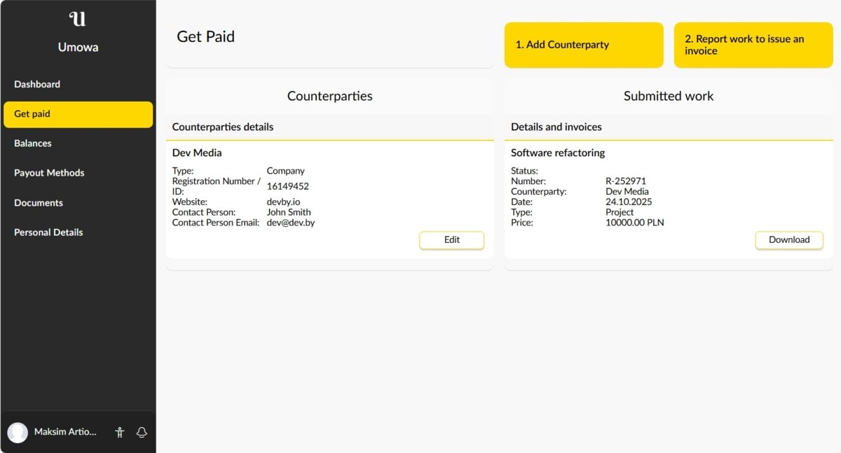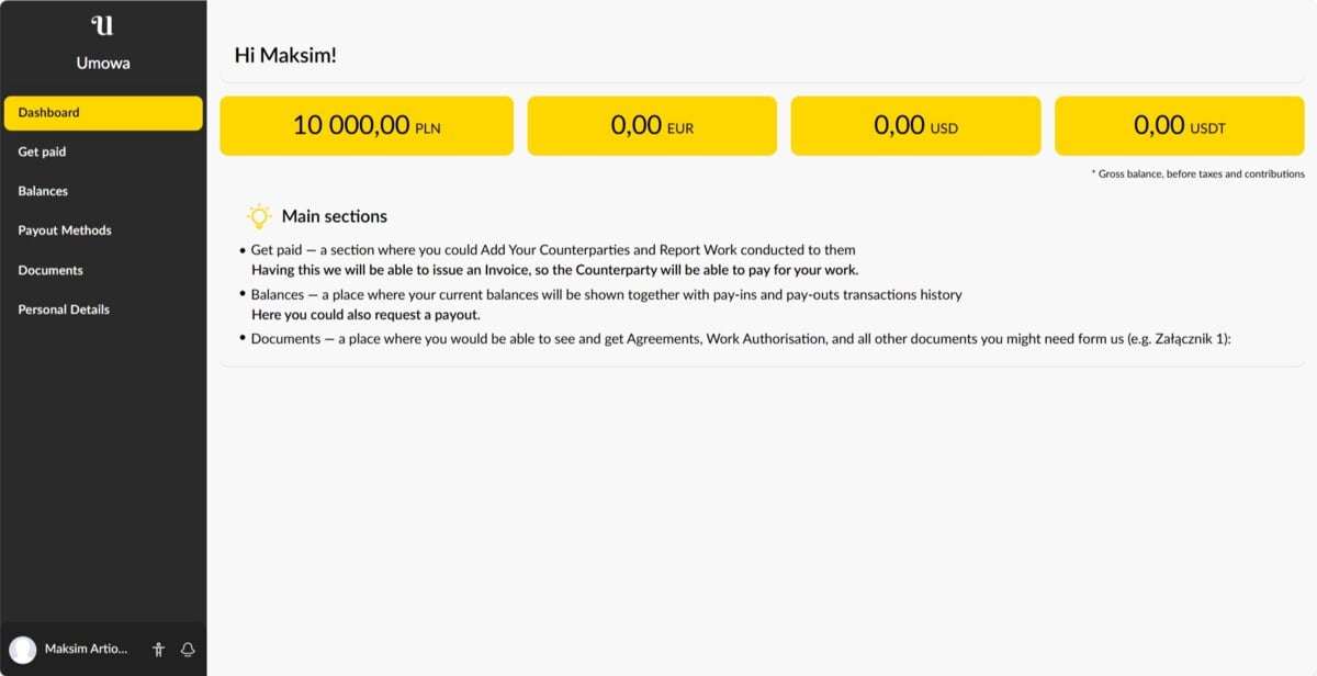 Umowa.io предлагает то, чего нет у польских инкубаторов: онлайн-платформу со встроенными балансами для моментального отображения полученных средств и их вывода по клику. Фаундер — беларус Максим Артёменко — применил опыт международных сервисов для работы с исполнителями, чтобы автоматизировать то, что другие до сих пор делают вручную.