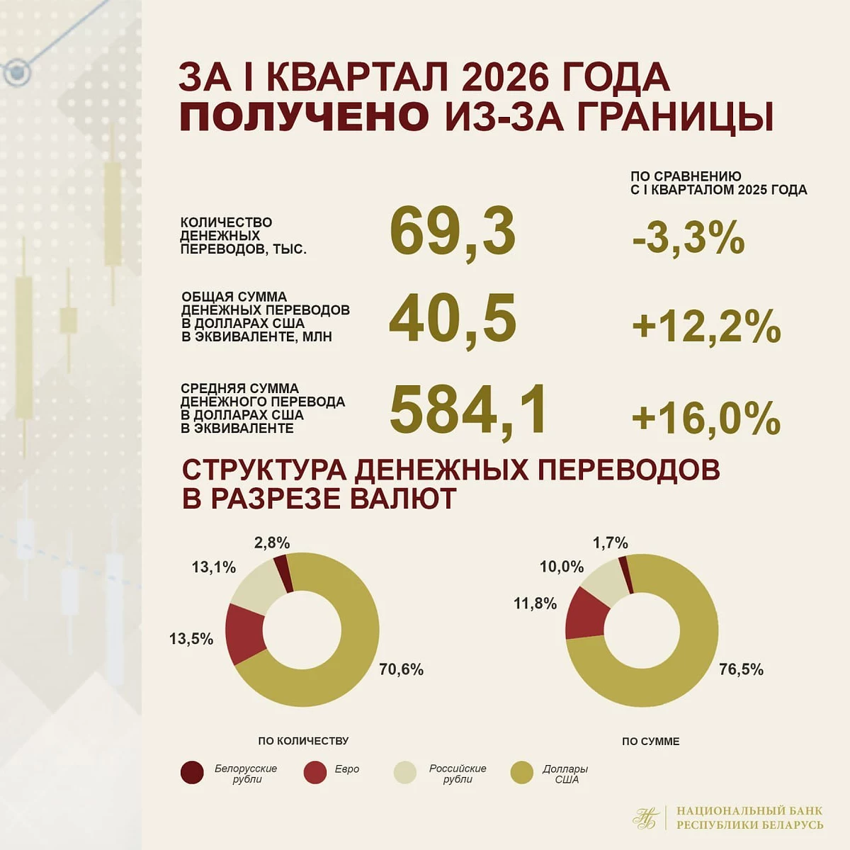 Нацбанк опубликовал данные по объёмам денежных переводов за границу и из-за границы в 1 квартале 2026 года. Оба потока увеличились, но число отправлений снизилось.