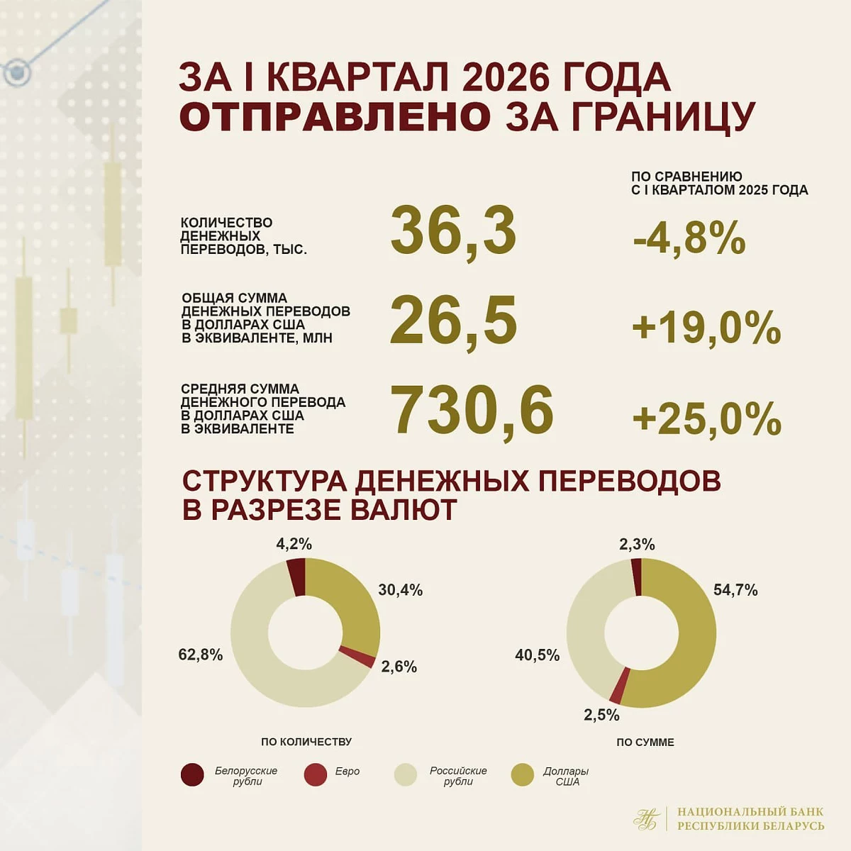 За рубеж из Беларуси было сделано 36,3 тысячи переводов — на 4,8% меньше, чем годом ранее. Общая сумма переводов выросла на 19% до $26,5 млн, а средний размер перевода — на 25% до $730,6.