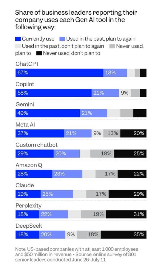 Наиболее используемым инструментом стал ChatGPT: о текущем использовании сообщили 67% бизнес-лидеров. На втором месте Microsoft Copilot с 58%, далее Google Gemini — 49%.