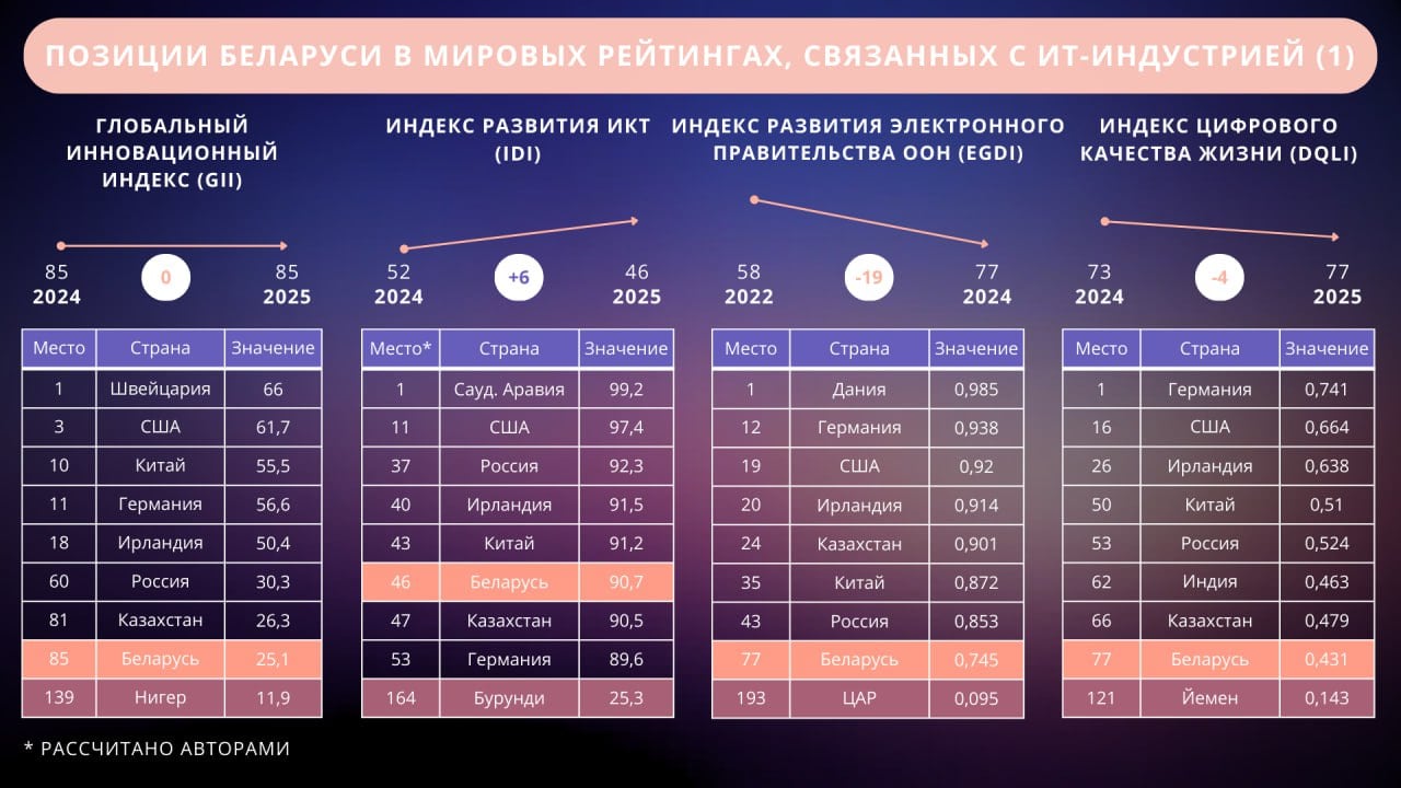 Минэкономики под конец года выкатило пост с подборкой мировых технологических рейтингов. Говорит, результаты Беларуси показывают «проблемы в условиях и результатах» развития местной ИТ-сферы.