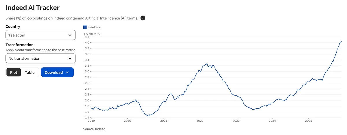 По свежим данным джобборда Indeed, общее число вакансий в стране по состоянию на конец 2025 года было всего на 6% выше допандемийных времён. А вот вакансий с упоминанием ИИ стало больше более чем 130% по сравнению с началом 2020 года.