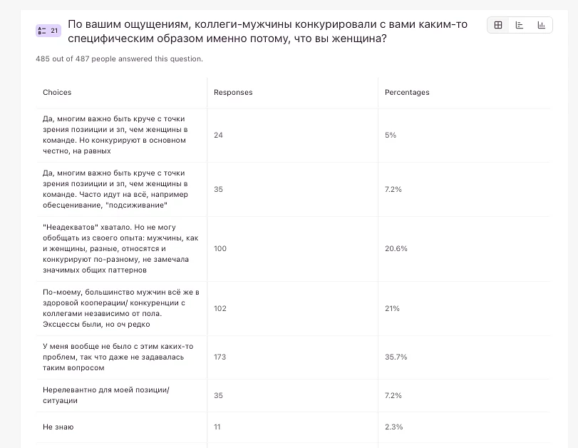 И ещё один аргумент в пользу относительного гендерного здоровья ИТ-отрасли: на вопрос про специфическую (нечестную) конкуренцию мужчин с женщинами в рабочих коллективах самый частотный ответ — «ноу проблем».