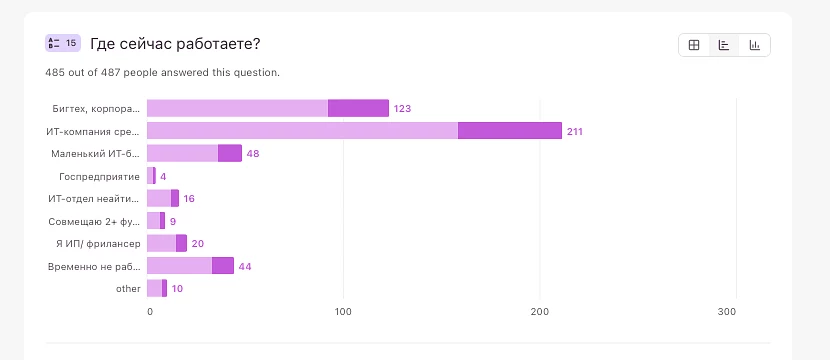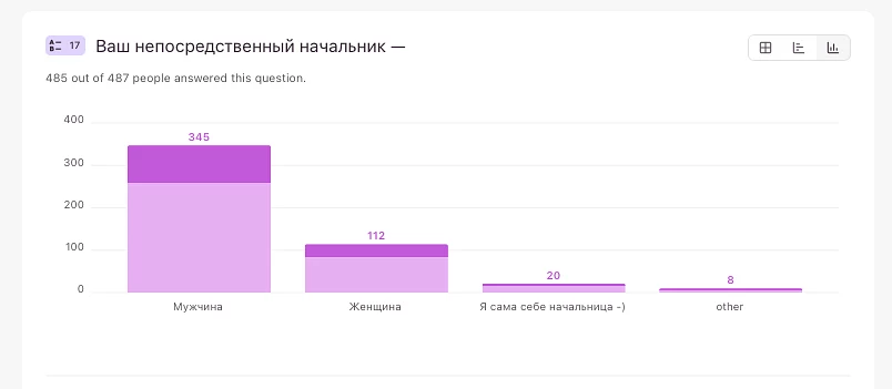 Больше трети айтишниц имеют подчиненных, значит выполняют руководящие функции. Понятно, что данные не претендуют на высокую точность: для выверенного результата нужно учитывать также долю женщин в ИТ-отрасли в целом.