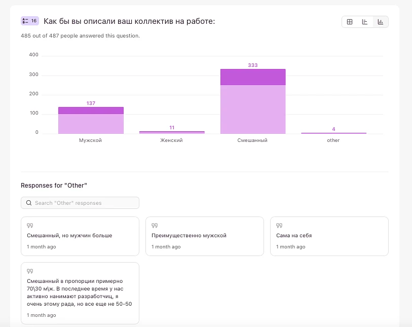 Причём в гендерном отношении этот коллектив как правило смешанный (70%). Только 28% айтишниц охарактеризовали свой рабочий коллектив как преимущественно мужской и 2% — как женский.