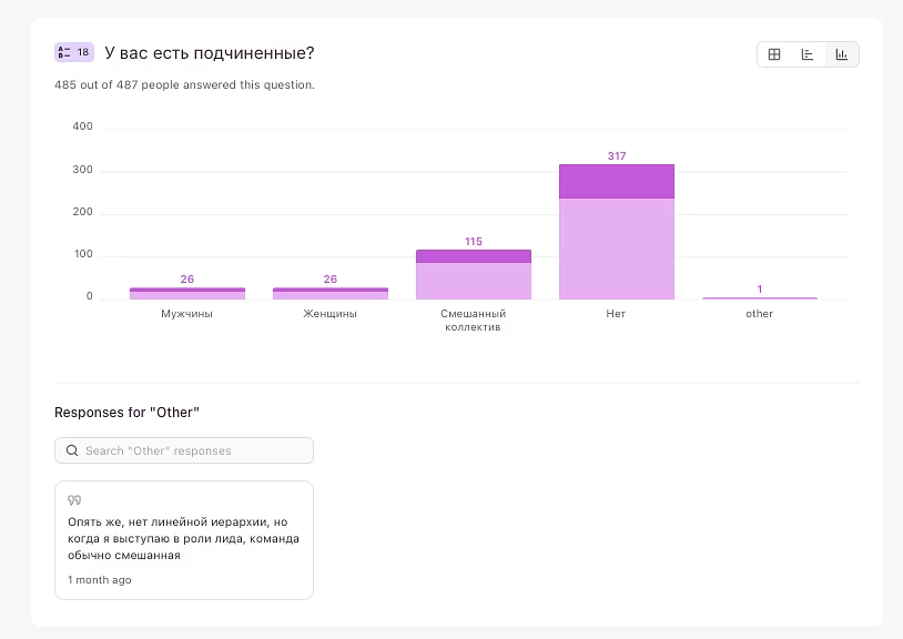 И — зеркальное отражение того же расклада — у 65% айтишниц нет подчиненных. У тех же 35%, кто занимает позицию начальницы, чаще всего в подчинении находится смешанный коллектив. В то же время почти треть из них (11% всех участниц) руководит преимущественно однополыми коллективами, половина их них (5% всех участниц) — мужскими.