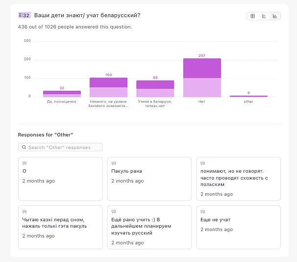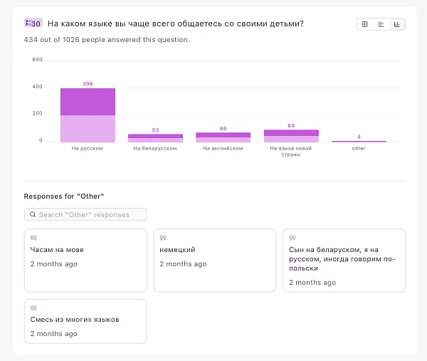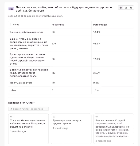 Кстати, про детей — выбор языка для общения с ними говорит о культурных приоритетах больше, чем просто выбор языка для домашнего общения между взрослыми. Дети есть меньше чем у половины участников анкеты, и почти все они усваивают от родителей преимущественно русскую речь и/или язык новой страны. Однако же каждый восьмой родитель говорит со своими детьми также/только по-беларусски.