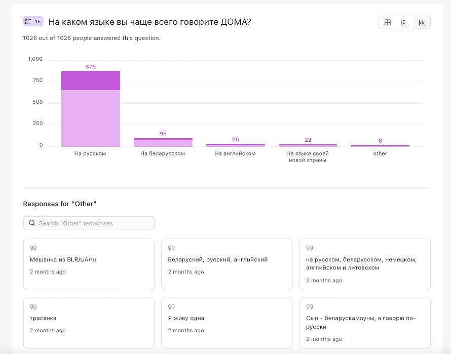 Подавляющее большинство беларусов — что дома, что за рубежом — предсказуемо говорят по-русски. Русский является языком домашнего общения для 85+% участников анкеты.
