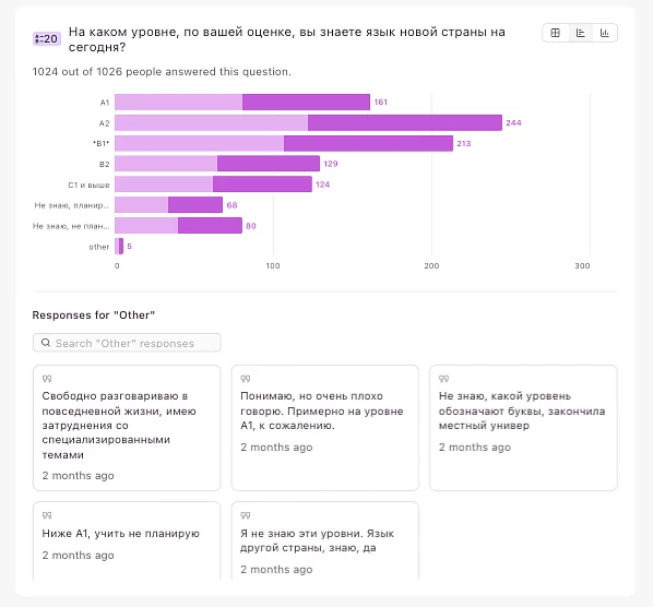Язык своей новой страны беларусы активно учат, треть владеет им уже на уровне B1-B2, около 40% — на уровне А1-А2, около 12% может похвастать уровнем С. Каждый седьмой правда ничем не может похвастать.