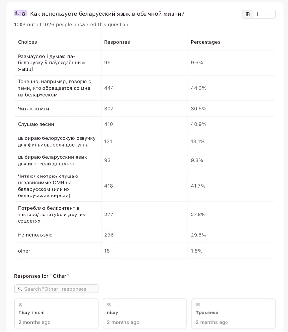 Основная сфера живого общения на беларусском правда сводится к ситуативным смолтокам: к тебе обратились на мове — ты ответил на мове. Плюс медиа, подкасты, песни, книги на беларусском. Каждый десятый, впрочем, по-беларусски не только говорит, но и думает. В общем, всё как в Беларуси. Или немного лучше?