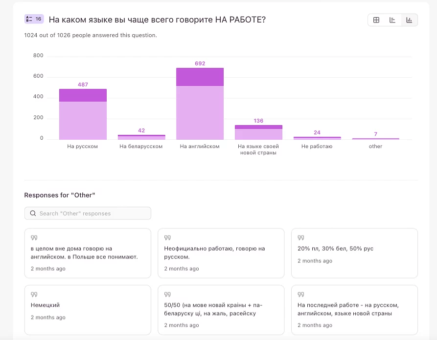 На работе — языковая ситуация кардинально другая. И в общем зависит от компании, в которой работает мигрант. Та почти половина, которая в работе использует русский и беларусский языки (но не только их), с большой долей вероятности осталась в компании с беларусскими корнями. Та, что язык новой страны, очевидно, устроилась на местном рынке. А так-то объединяющим языком для двух третей+ беларусских айтишников естественным образом является английский.