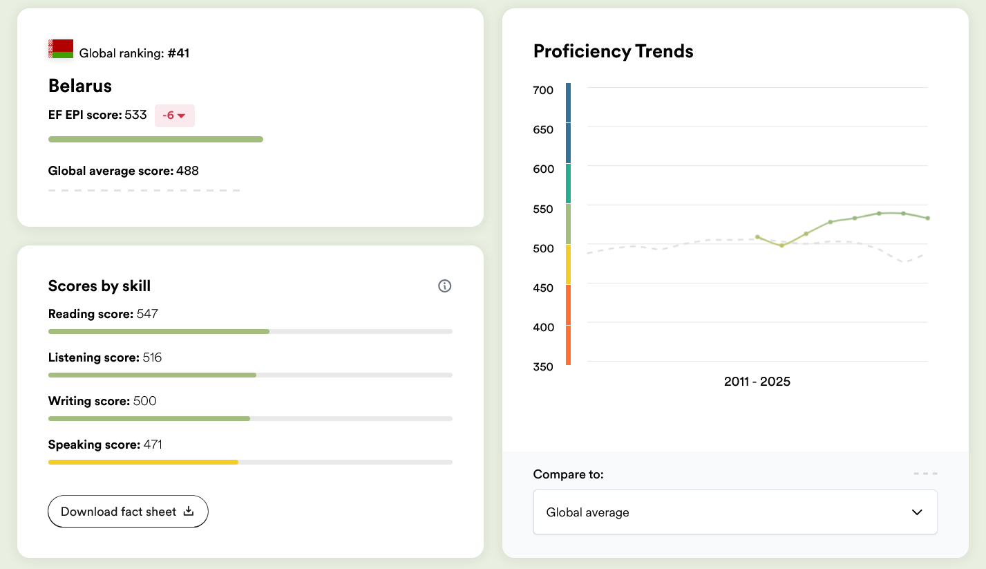 Авторы списка разделяют страны на пять групп: с очень высоким, высоким, средним, низким и очень низким уровнем английского. Беларусь идёт в средней группе с результатом 533 балла (на 6 меньше, чем год назад) при среднемировых 488. В Европе мы занимаем 29 место из 37. Беларусь уступает Польше (15 место), Латвии (16) и Литве (33) — они в группе с высоким показателем владения английским, а также Грузии (35).