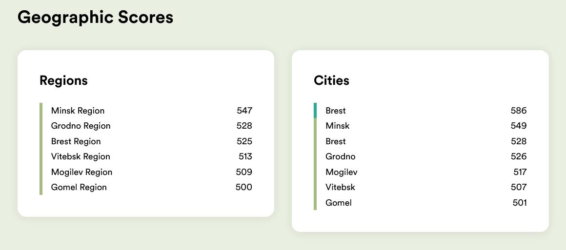 В списке городов Минск набрал 549 баллов, а лидирует по Беларуси Брест — у него 586 баллов, и он относится к группе с высоким уровнем, а не со средним. По областям первое место занимает Минская.