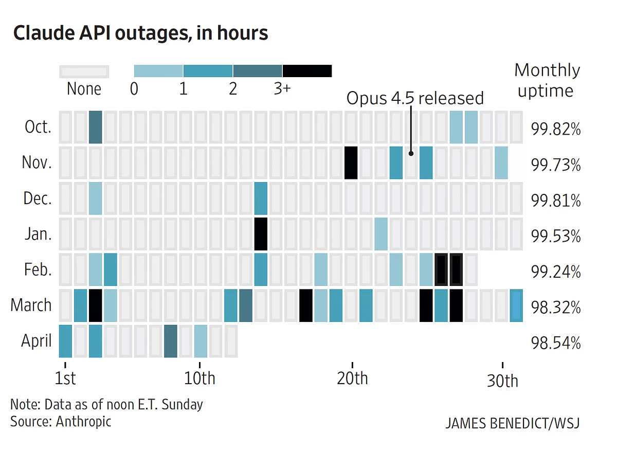 Сбои в работе API Claude по месяцам и уровень доступности сервиса: в феврале–марте перебои участились, а аптайм снизился. Источник: The Wall Street Journal.