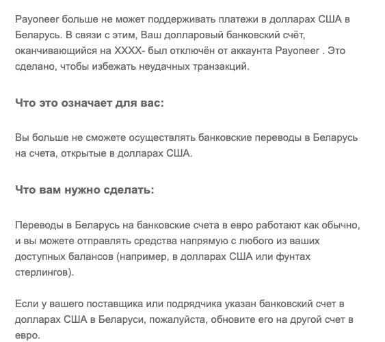 Сервис стал рассылать им уведомления о том, что «чтобы избежать неудачных транзакций», долларовые банковские счета беларусов отключают от аккаунтов Payoneer.