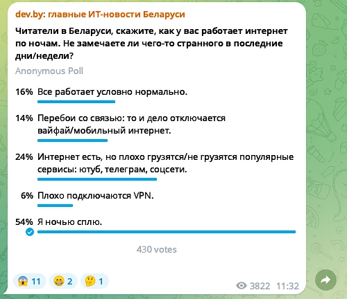 «Сегодня ночью примерно с 2 до 3 у меня не работали тикток, ютуб и телеграм. Я из Минска, оператор — Белтелеком», — рассказал читатель про ночь на 15 апреля.