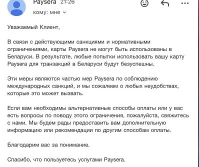 «Карты Paysera не могут быть использованы в Беларуси. … Эти меры являются частью мер Paysera по соблюдению международных санкций», — говорится в емейле.