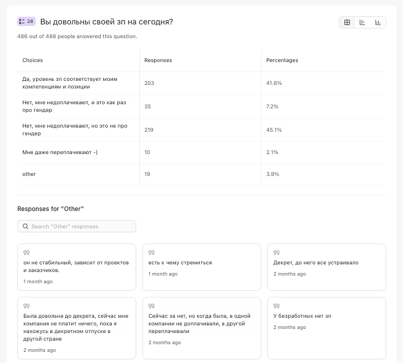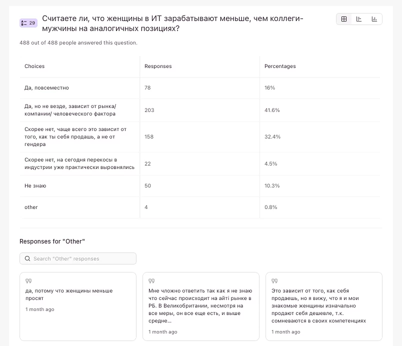 Наибольшая часть участниц (45%) согласна, что им недоплачивают, но это, по их мнению, не про гендер, а еще почти столько же (42%) и вовсе довольны своей зарплатой (10 айтишницам даже переплачивают — тссс!).